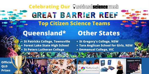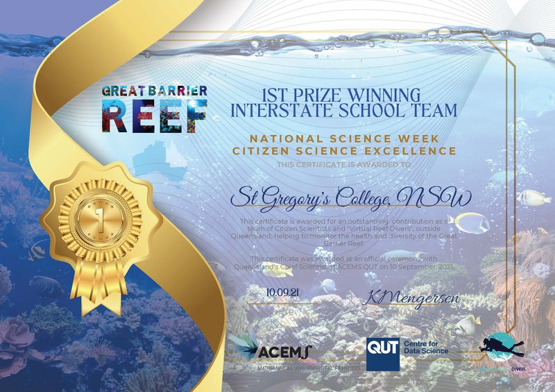 During National Science Week, held in August 2021, students in Years 7-10 had an opportunity to enter the Great Barrier Reef “Virtual Reef Diver” Citizen Scientists initiative. The competition was organised by the Australian Research Council Centre of Excellence for Mathematical and Statistical Frontiers (ACEMS) and Queensland University of Technology (QUT).