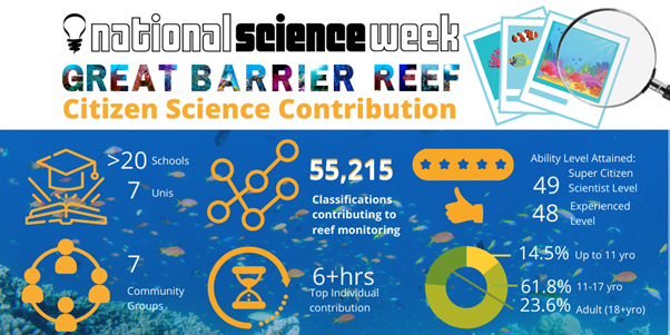 Participants entered from all over Australia and during science week over 55,000 images had been classified. This helps researchers classify hard coral and contribute to the dataset used to monitor the Reef. This dataset is then used in statistical modelling to predict the health of the Great Barrier Reef across its 4,000 reefs.
